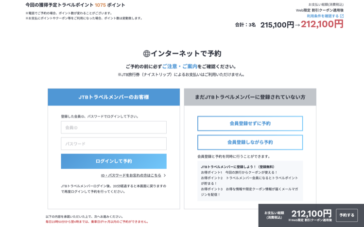 会員登録するとJTBのポイントが獲得できますが、会員登録せずにそのまま予約することも可能です。あとは、個人情報と支払い方法を入力すれば予約完了です。▼