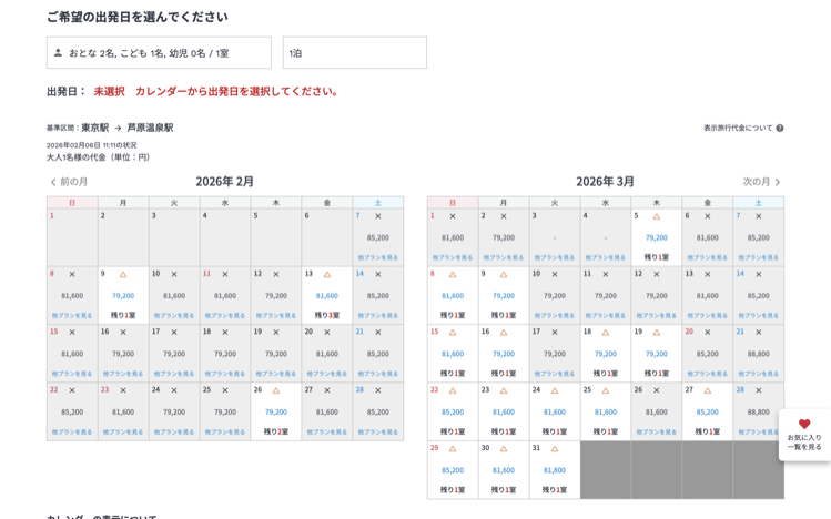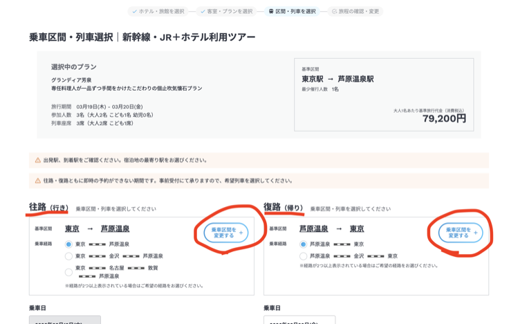 日付を選ぶと自動的に宿泊地の最寄り駅が設定されます。表示された新幹線乗車区間を変更したい場合はここで設定します。行きと帰りで別の駅を設定することも可能です。▼