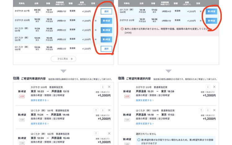 設定された駅に停車する新幹線が表示されます。人気の便だと満員で購入できない可能性もあるので、第1〜第3希望まで選択します。▼