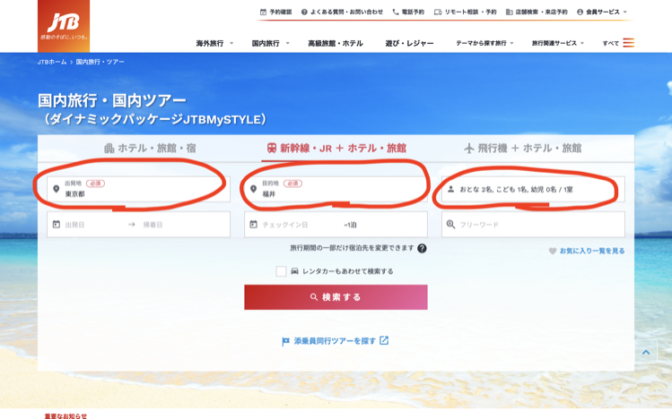 JTBの公式サイトから予約ができます。まずは、出発地・目的地の都市名と人数を入力します。レンタカーは出発日と到着日を入力しないと検索できないので、必要な場合は日付を入力します。▼